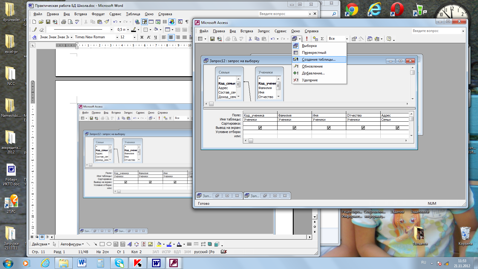 дважды щелкните на значке Создание запроса в режиме Конструктора – откроется бланк запроса по образцу, в окне Добавление таблицы выберите таблицы СЕМЬИ и УЧЕНИКИ;