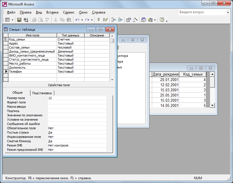 Закройте окно создания структуры таблицы в режиме Конструктор. При закрытии окна присвойте таблице имя СЕМЬИ.