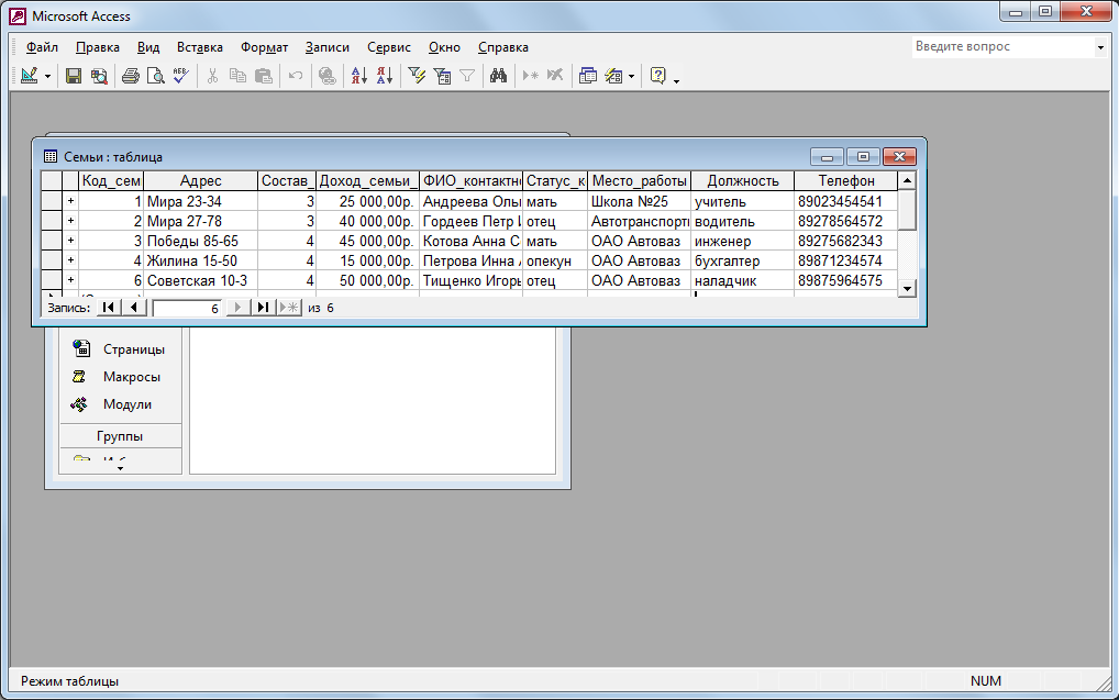 Пример таблицы СЕМЬИ в режиме просмотра данных показан на рисунке: