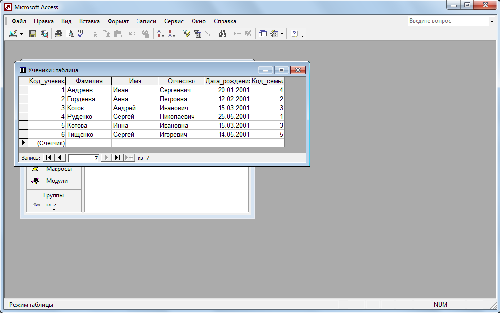 Пример таблицы УЧЕНИКИ в режиме просмотра данных показан на рисунке: