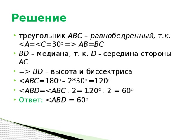 АВ=ВС ВD – медиана, т. к. D - середина стороны АС = ВD – высота и биссектриса 180 о – 2*30 о =120 о : 2= 120 о : 2 = 60 о Ответ: = 60 о " width="640"