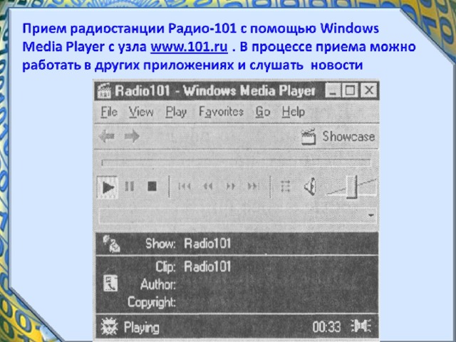 Таким образом, для передачи по компьютерным сетям мультимедиа файлов в стандартных цифровых форматах требуются линии связи с высокой пропускной способностью, а воспроизведение файлов возможно только после их предварительной загрузки на локальный компьютер.