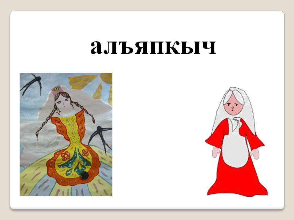 - Алъяпкыч- ул татар халкының бик борынгыдан килгән һәм яратып кия торган үзенчәлекле киеме. Күбрәк алъяпкычлар эш киеме хезмәтен үтәгән. Аны күлмәк өстеннән кияләр һәм ул бик матур, күз явын алырдай чәчәкләр, җиләк рәсемнәре белән бизәлә.(Рәсемен слайдта күрсәтү).