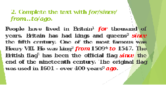 People have lived in Britain1…….thousands of years. Britain has had kings and queens2……..the fifth century. One of the most famous was Henry VIII.