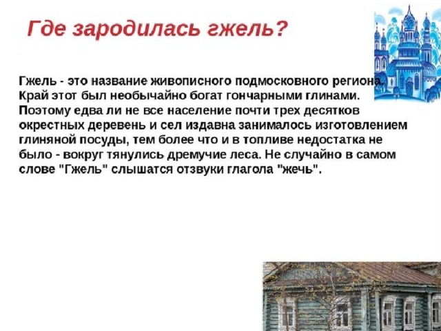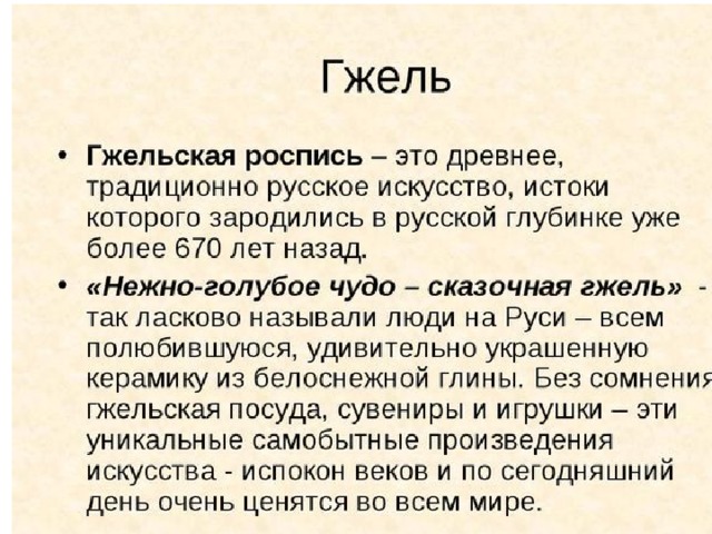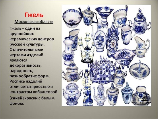 Своё название она получила от названия села, что находится в 60 км от Москвы. Поэтому Родиной Гжели считается Московская область. Там впервые стали изготавливать эти изделия. Первые гжельские изделия – из глины. Это произошло очень давно – ещё в 14 веке, почти 700 лет назад.