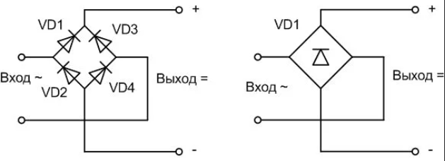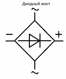 В зависимости от значения выпрямленного напряжения каждое плечо моста может состоять из одного, двух и более диодов. Полярность выпрямленного напряжения на схемах не указывают так как ее однозначно определяет символ диода внутри квадрата.