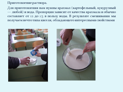 Для приготовления нам нужны крахмал (картофельный, кукурузный — любой) и вода. Пропорция зависит от качества крахмала и обычно составляет от 1:1 до 1:3 в пользу воды. В результате смешивания мы получаем нечто типа киселя, обладающего интересными свойствами. (Приложение 1)