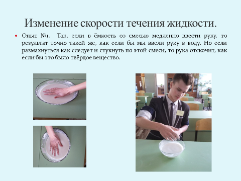 Опыт №1. Так, если в ёмкость со смесью медленно ввести руку, то результат точно такой же, как если бы мы ввели руку в воду. Но если размахнуться как следует и стукнуть по этой смеси, то рука отскочит, как если бы это было твёрдое вещество.