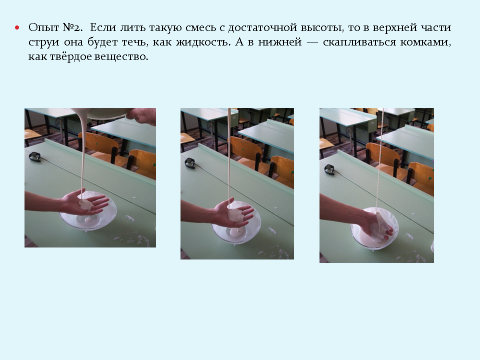 Опыт №2. Если лить такую смесь с достаточной высоты, то в верхней части струи она будет течь, как жидкость. А в нижней — скапливаться комками, как твёрдое вещество.