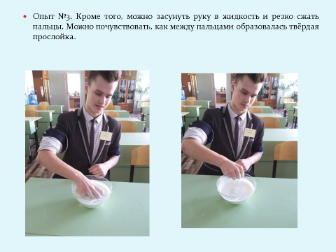Опыт №3. Кроме того, можно засунуть руку в жидкость и резко сжать пальцы. Можно почувствовать, как между пальцами образовалась твёрдая прослойка.