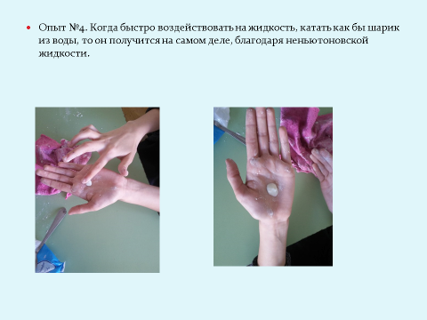 Опыт №4. Когда быстро воздействовать на жидкость, катать как бы шарик из воды, то он получится на самом деле, благодаря неньютоновской жидкости.