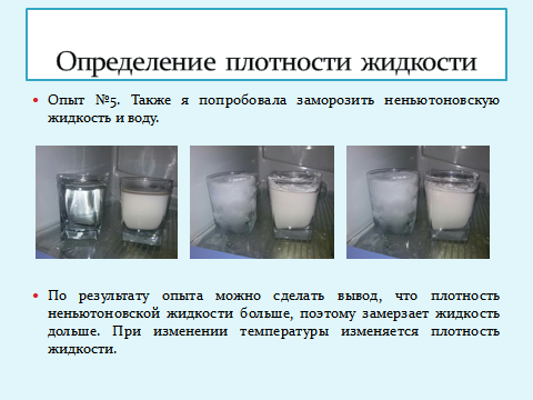 Опыт №5. Также я попробовала заморозить неньютоновскую жидкость и воду. Предполагаю, что время заморозки может быть одинаково, так как в состав неньютоновской жидкости входит вода.