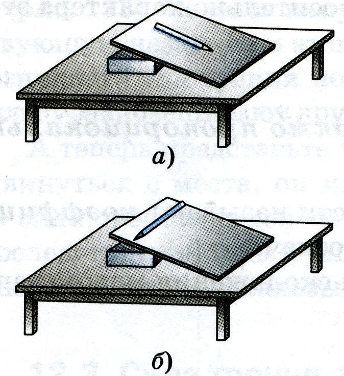 Наклон книги сделайте таким, чтобы карандаш медленно соскальзывал с книги. А теперь разверните карандаш так, как показано на рисунке б).