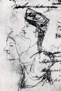Выполненный рукою Пушкина портрет няни с натуры в повойнике и фантазийный, в образе невесты, в сарафане и венце, какие носили и в Псковской губернии.