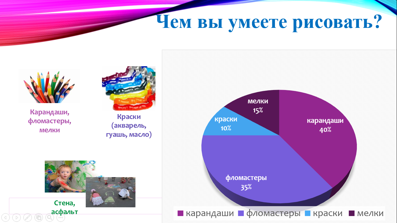 Все умеют и любят рисовать карандашами-40%, мелками-15%, фломастерами-35%, красками-10%