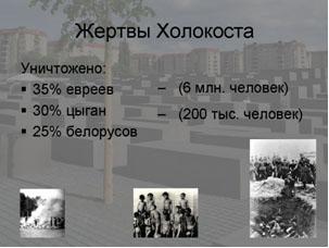 В ходе холокоста было уничтожено примерно 35 % евреев всего мира, около трети цыган, четверть белорусов. Также подвергались уничтожению нетрудоспособные и душевнобольные. Из всех злодеяний нацистской Германии это самое страшное.