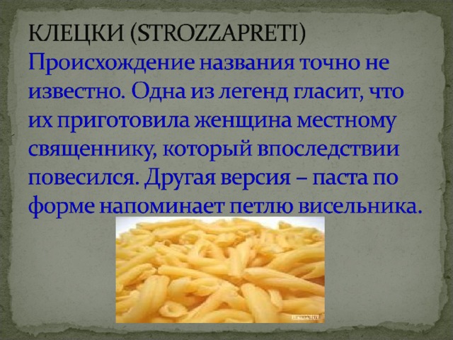 - Небольшая паста, чаще всего с начинкой ,но может быть и без нее. По внешнему виду похожи на шапочки или маленькие пельмени. Подают их с или с бульоном, или с соусом, или просто с сыром.