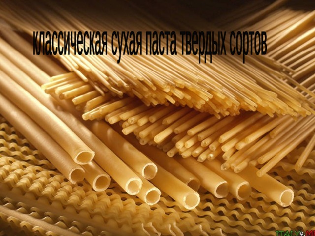 - Сухая паста – это паста, высушенная с целью длительного хранения. Классическая итальянская паста изготавливается только из пшеницы твердых сортов и воды. Крупнейшие производители пасты обязательно придерживаются этого золотого правила. Однако не менее широко встречается и сухая паста, изготовленная из мягких сортов с добавлением яиц. Секретными же составляющими, которые придают итальянской пасте неповторимый вкус, являются процесс их выдавливания или экструзии и способ сушки.
