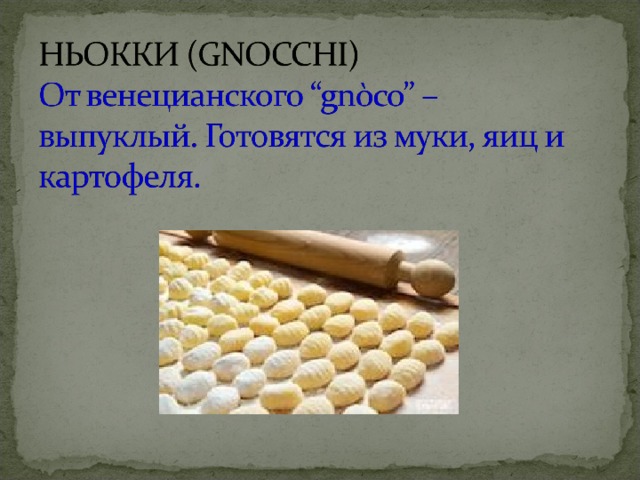 - Это маленькая паста с начинкой. Небольшие кусочки теста могут быть нафаршированы шпинатом или сыром или мясом. По внешнему виду напоминает варенички. Подается обязательно с соусом.