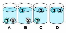 14. В сосуде с водой находятся два шарика: 1-парафиновый и 2-стеклянный. Укажите расположение шариков в воде. (плотность воды 1000кг/м3, парафина 900кг/м3, стекла 2500кг/м3.)