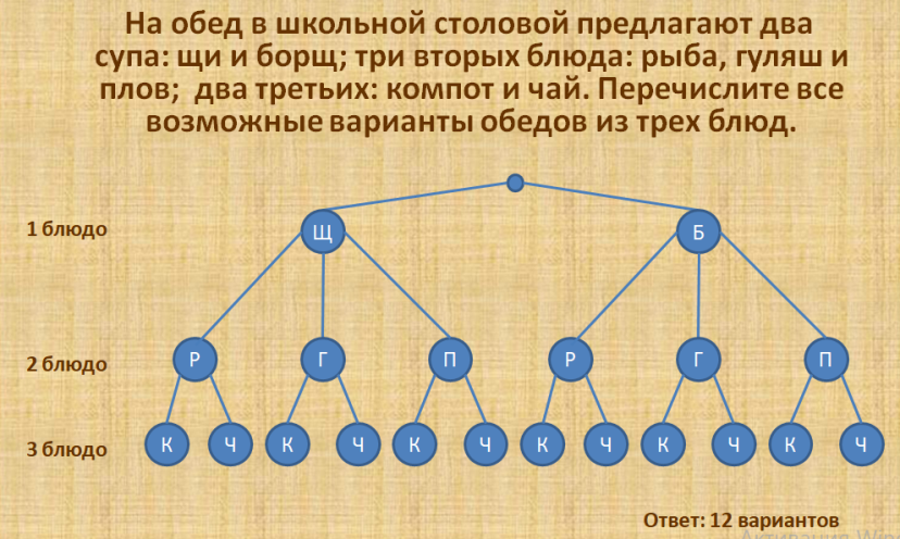 На обед в школьной столовой предлагают два супа: щи и борщ; три вторых блюда: рыба, гуляш и плов; два третьих: компот и чай. Составьте граф всех возможных вариантов обедов из трех блюд.