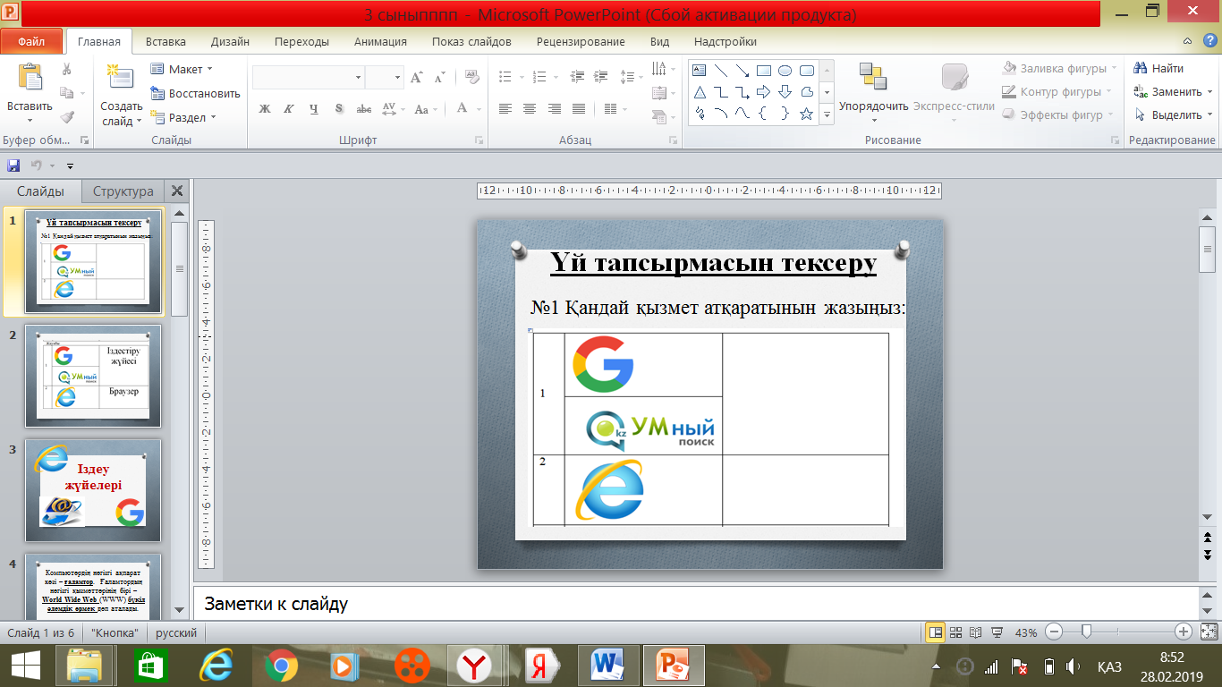 | Жаңа тақырып Іздеу жүйелері Компьютердің негізгі ақпарат көзі – ғаламтор. Ғаламтордың негізгі қызметтерінің бірі – World Wide Web (WWW) бүкіл әлемдік өрмек деп аталады. Іздеу жүйесі – мәліметті ғаламтордан іздеу мүмкіндігін ұсынатын веб-сайт. Сайт немесе Веб–сайт – (Web – тор, желі және site- орын, желідегі орын) – ғаламтордағы мәліметтер жиынтығы. Қызықты ақпарат Ең тұңғыш іздеу жүйесі 1994 жылы пайда болды. Ең көп сұранысқа ие іздеу жүйелері: Талқыланатын сұрақтар ұсыныңыз: Интернет дегеніміз не? Қажетсіз контактілердін тәуекелділігін атап беріңіз Компьютерді вирустан қалай сақтауға болады? 2 тапсырма Кестеге интернет арқылы жұмыс жасағанда орындалатын тағы екі ереже қосыңыз. Өзгерісті сақтаңыз. Саралау *** арқылы . Тапсырманы орындаған кезде бүгінгі сабақтын тақырыбы бойынша сұрақтар қою. Сабақты қорытындылау Қалыптастырушы бағалау өткізу 1 тапсырма: Компьютерлік программалардын түрін анықтаңыз. Дескрипторлар 1 номерлі суретте ұсынылған программаны анықтайды 2 номерлі суретте ұсынылған программаны анықтайды 3 номерлі суретте ұсынылған программаны анықтайды |