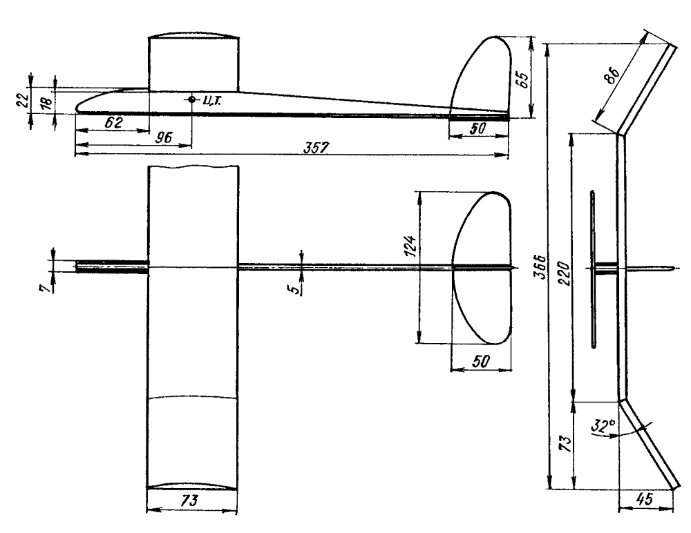 Сегодня мы познакомимся с конструкцией весьма «летучего» метательного планера, подготовленной с использованием материалов из чешского журнала «Моделярж а модели». Хочу предупредить, что модель эта может быть построена по любой технологии и из любых материалов — важно лишь соблюдение весовых данных, центровки и геометрии планера.