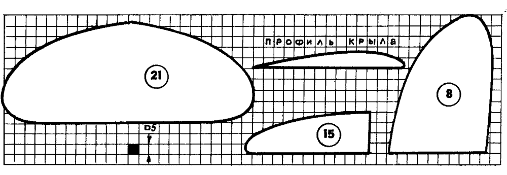 КРЫЛО — наборное, состоящее из центроплана и двух ушек. И центроплан, и ушки собираются из обычных (толщиной 2 мм) и усиленных (толщиной 3 мм) бальзовых нервюр, верхнего и нижнего лонжеронов (сосновых реек 5x3 мм), а также сосновых задней (рейка 10x3 мм) и передней (рейка 5x5 мм) кромок.