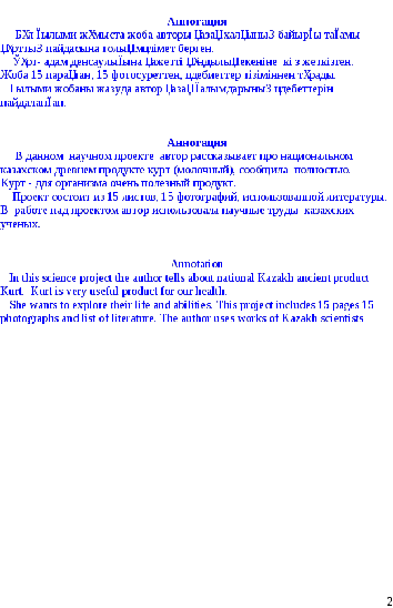 Ғылыми жоба тақырып негізінде жасалған. «Қазақтың ұлттық тағамы – құрттың адам ағзасына пайдасы» туралы мәліметтерін жинақтап, оларға зерттеу жұмыстары жүргізілген. Құрттың дәрлік қасиеттерін анықтаған. Зерттеу мақсаты мен міндеті нақты қойылып, жүйелі түрде жұмыс жүргізілген. Соның нәтижесінде көзделген мақсатқа жеткен.