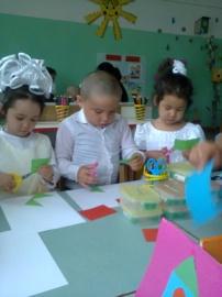 «Өнер » орталығы Балалар мен бірге пішіндер арқылы құстарға ұя жасату .пішіндерді еске түсіру ,түстерін айту .Жұмыстарын әдемі үйлесімді етіп жасай білуге үйрету .