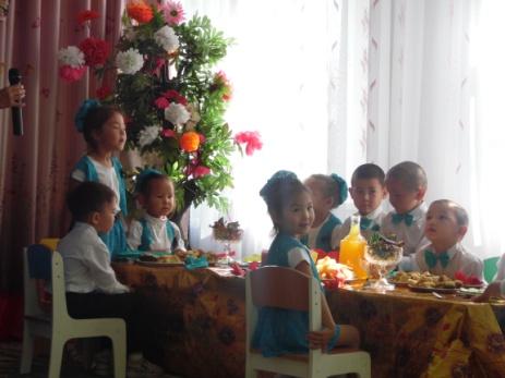 Жүріңдер бәріміз дастархан басына жайғасайық. Өздеріңе арналған торттан дәм татыңдар, мына жанып тұрған сан қандай сан? (балалардың жауаптары, 5- саны. Тортты үрлейді).