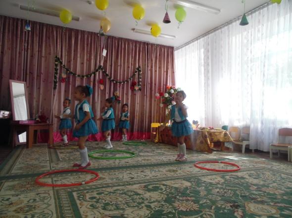 Тәрбиеші: Балалар, туған күн иелері келіп қалған сияқты (көңілді әуенмен сырттан жаз айларында 5- ке толған балалар кіреді. Келген балаларға әдемі гүл сыйлайды).
