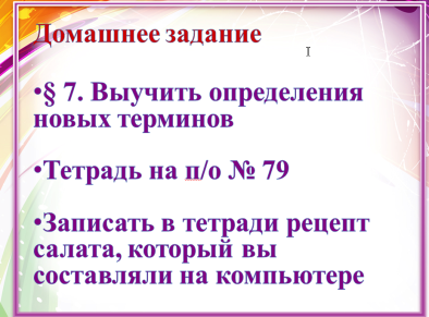 | Домашнее задание п. 7. Выучить определения новых терминов. Тетрадь на печатной основе № 79. Творческое – записать в тетради рецепт салата, который вы составляли на компьютере. На следующем уроке мы продолжим изучение данной темы, повторим возможности текстового редактора, используем созданный вами файл в качестве иллюстрации и оформим документ в виде готового рецепта.