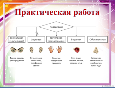 | Практическая работа. Итак, ребята, вернёмся к чувственному познанию окружающего мира… Человек познаёт окружающий мир, в том числе, с помощью своих органов чувств (На слайде изображены органы чувств). Вспомните виды информации в соответствии с 5-тью органами чувств? Визуальная Аудиальная Тактильная Обанятельная, Осязательная Какие виды информации может обрабатывать компьютер (визуальную, аудиальную).