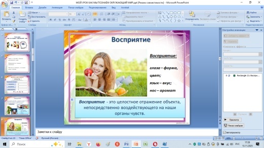 | Для того, чтобы включить все остальные наши органы чувств, а так же для того, чтобы лучше запомнить урок и термины ощущение, восприятие, представление, вы выполните практическую работу «Приготовление салата» - ну, конечно не в прямом смысле этого слова, а на компьютере, вызывая в себе приятные вкусовые ощущения, используя представление о салате и активизируя восприятие, как будто эти блюда действительно оказались здесь, в нашем кабинете.