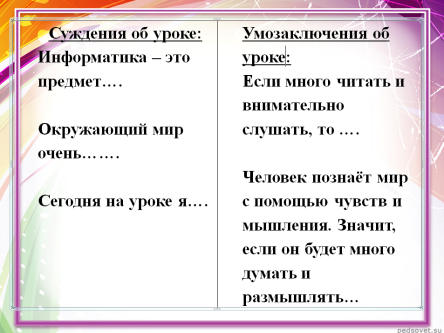 Какие вы узнали новые понятия? О чём вы получили представление? Какие у вас остались ощущения от урока? Какие у вас работали органы чувств? Составьте одно суждение и одно умозаключение о нашем уроке Можете использовать начало со слайда…