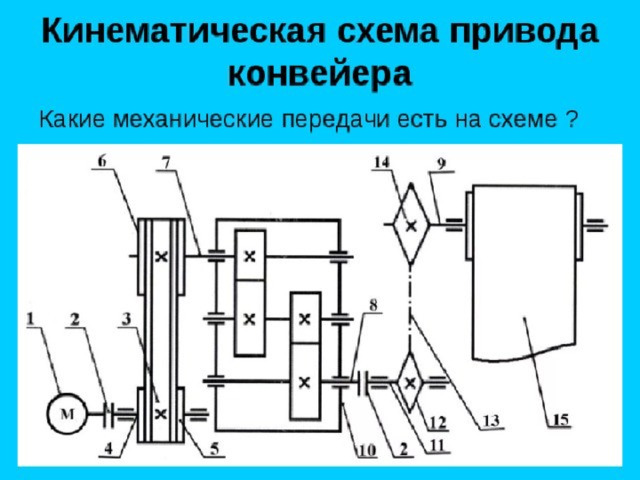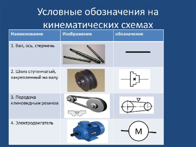 Кинематическая схема показывает последовательность передачи движения от двигателя (источника движения) через передаточный механизм к исполнительным органам изделия.