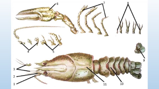 4. Покров тела - кутикула, состоящая из хитина и пропитанная карбонатом кальция. В состав кутикулы и гиподермы входят различные пигменты. Наиболее стойкие из них — красные (именно поэтому вареные раки имеют красную окраску: остальные пигменты при варке разрушаются).