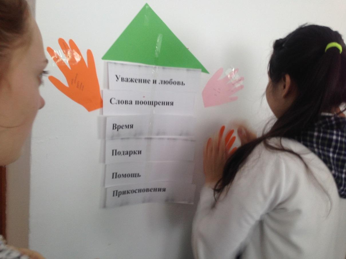 У студентов листочки « кирпичики» с надписями 5- проявлений любви: слова поощрение, время, помощь, прикосновение. Показать как с помощью этих понятий проявляется любовь семейный отношений.