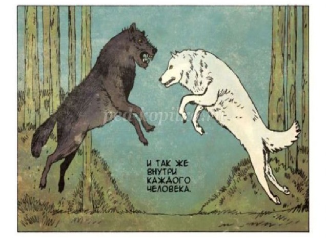 Когда-то давно старый индеец открыл своему внуку одну жизненную истину. — В каждом человеке идет борьба, очень похожая на борьбу двух волков. Один волк представляет зло — зависть, ревность, сожаление, эгоизм, амбиции, ложь... Другой волк представляет добро — мир, любовь, надежду, истину, доброту, верность... Маленький индеец, тронутый до глубины души словами деда, на несколько мгновений задумался, а потом спросил: — А какой волк в конце побеждает? Старый индеец едва заметно улыбнулся и ответил: — Всегда побеждает тот волк, которого ты кормишь.