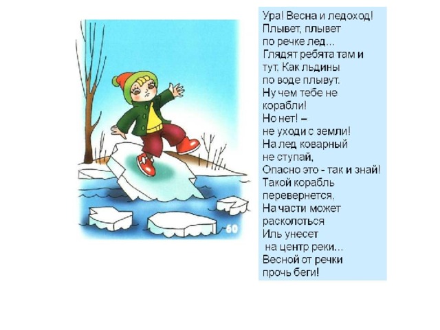 Лёд кажется крепким. Но это лишь на первый взгляд. Весенний лёд очень коварен и отличается от осеннего и зимнего льда. Осенний лёд под тяжестью человека трещит, предупреждая об опасности, а весенний - напитался талыми водами, побелел, надулся, весь потрескался и не способен выдержать вес человека. Такой лёд в любой момент может рассыпаться под ногами, превратиться в ледяную кашу. Он вот-вот тронется, поплывёт вниз по течению. Ледоход – захватывающее зрелище, которое привлекает внимание всех людей, независимо от возраста.