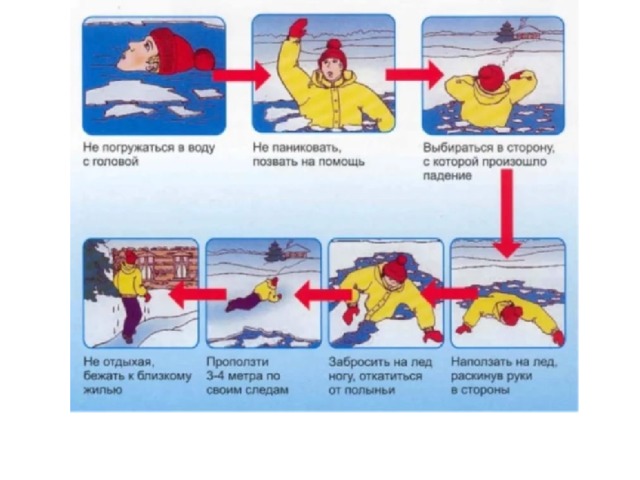 широко расставив руки, без резких движений, постараться наползти на лёд, а затем, набросив ногу на лёд, откатиться;