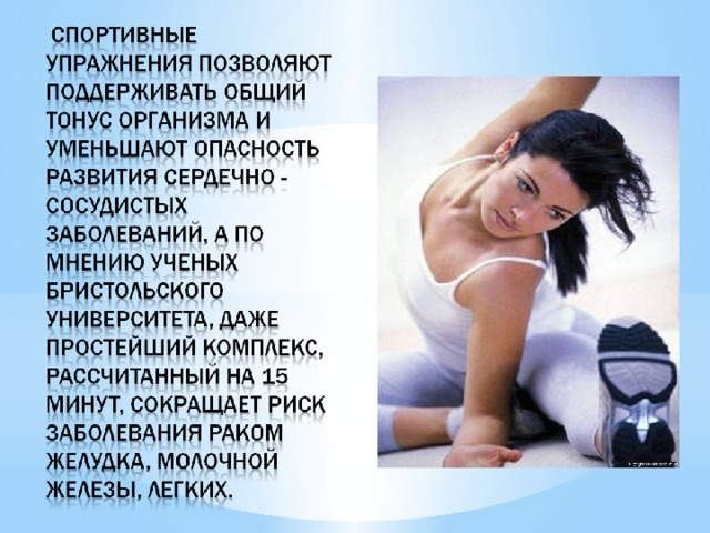 - "Физическая активность - ключевой компонент сохранения здоровья, и нам нужно приложить все усилия, чтобы не высиживать или вылеживать свои болезни, а самостоятельно их предупреждать с помощью приятной зарядки", - утверждает специалист в области исследования рака профессор Кен Фокс.