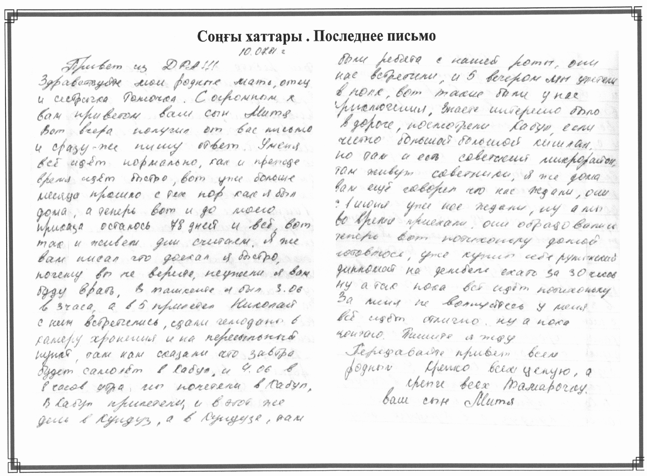 10.07.81. Привет из ДРА!!! Здравствуйте мои родные мать, отец и сестричка Томочка.С огромным приветом я ваш сын Митя. Вот вчера получил от вас письмо и сразу пишу ответ.У меня все идет нормально,вот и до моего приказа осталось 78 дней и все вот так и живем дни считаем.Я же вам писал,что доехал я быстро, почему вы не верите, неужели я вам буду врать. В Ташкенте я был 3.06 в 3 часа, а в 5 прилетел Николай сним встретились, сдали чемоданы в камеру хранения и на перевальный пункт, там сказали, что завтра будет самолет в Кабул.В Кабул прилетели и в этот же день в Кундуз, а в Кундузе были ребята с нашей роты, они нас встретили, и в 5 вечером мы улетели в полк,вот такие были у нас прключения. Знаете интересно было в дороге, посмотрели Кабул, если честно большой- большой кишлак. Но там и есть советский микрорайон, там живут советники.