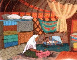 Правая часть сцены: круглый стол с казахским орнаментом, казахская посуда, сундук, ковёр, решётки юрты (в углу), на них ковёр, ленты, шкурка лисы, домбра, виды казахских узоров на стенах, изображение видов юрт, надпись:
