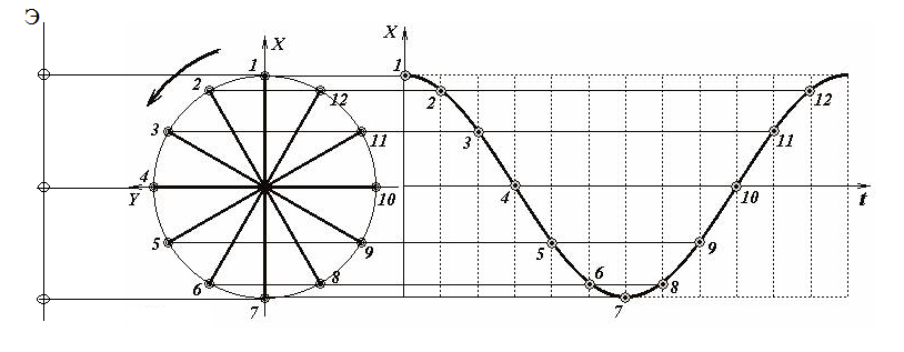 Для построения этой модели обратим внимание, что равномерное движение точки по окружности является периодическим процессом.