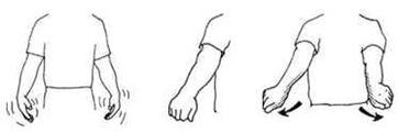То же, что в упражнении 1. Развернуть ладони наружу, вернуться в исходное положение. Повторить 15-20 раз.Сидя или стоя, руки, согнутые в локтях, в стороны, расслабленные кисти свободно опущены. Потряхивая руками, сгибать и разгибать расслабленные кисти. Повторить 15-20 раз.