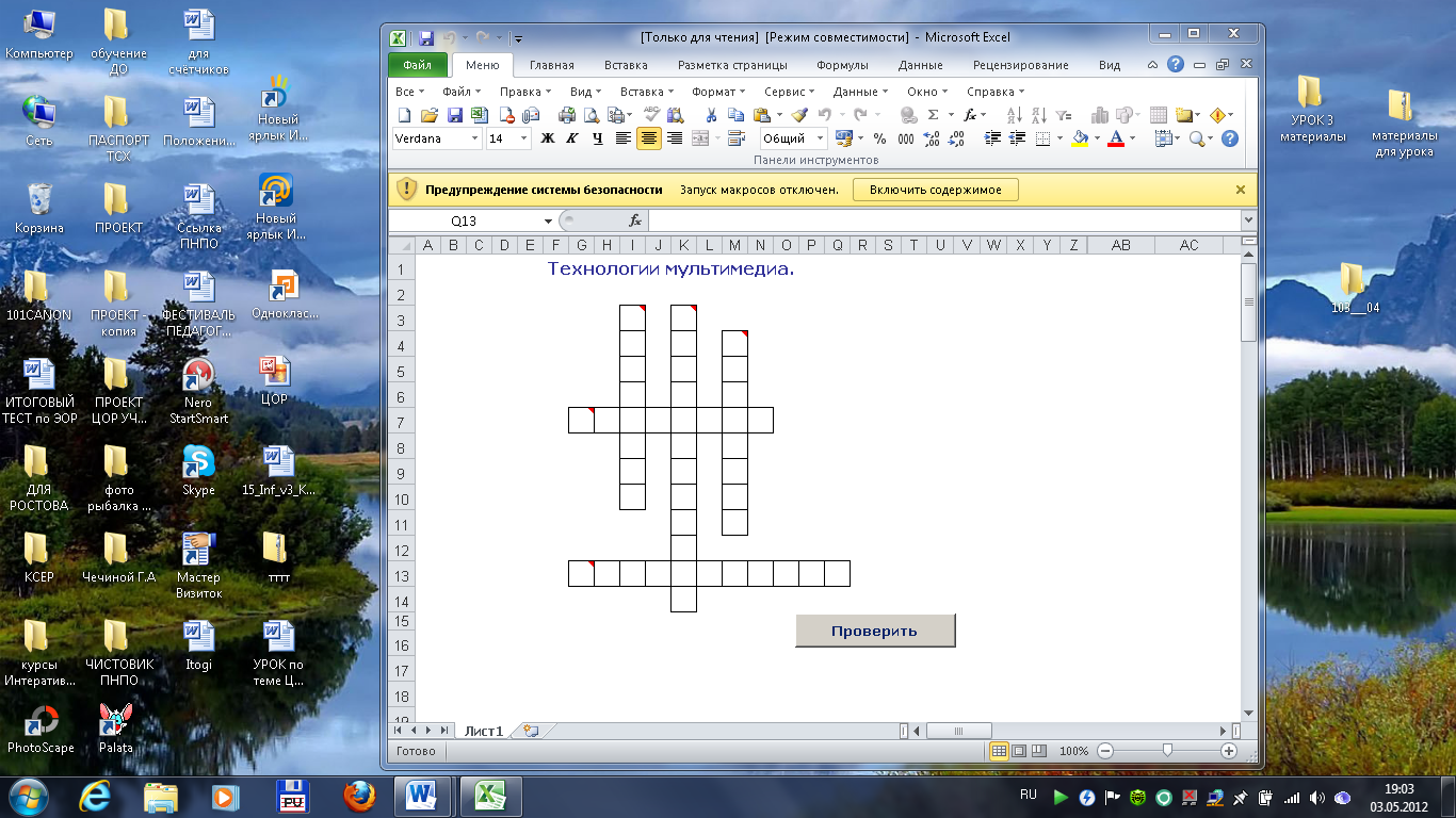 | 2 | Кроссворд по теме: "Технологии мультимедиа" (Ресурс: N 125793) | Интерактивное задание | Кроссворд (Самопроверка учениками освоения системы понятий изученной темы в форме решения кроссворда.) |
