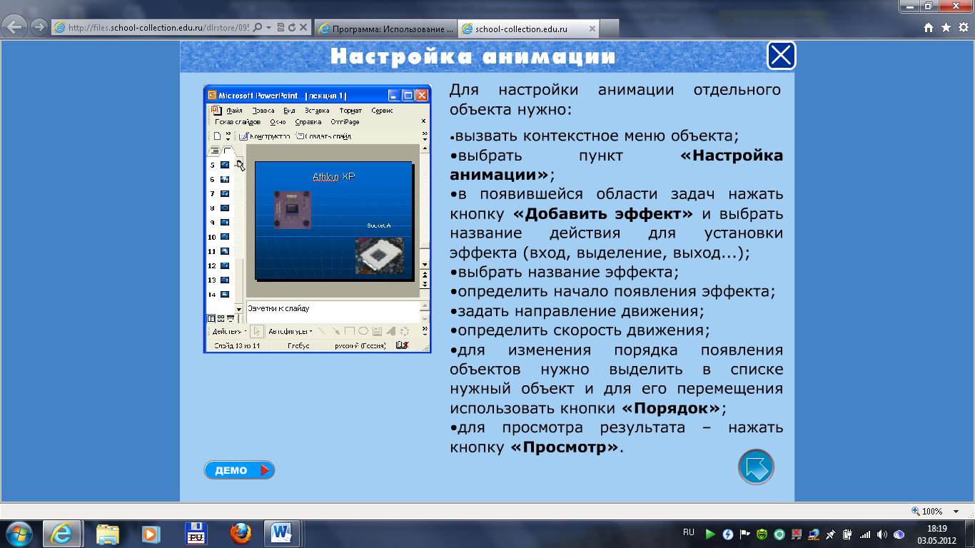 | 4 | Введение нового материала | Единая коллекция цифровых образовательных ресурсов Настройка анимации и звука в PowerPoint (Ресурс №3)  | Учитель рассказывает алгоритм настройки анимации и звука, рассказ сопровождается демонстрацией ЭОР. | В тетрадях записывают алгоритм настройки анимации и звука. | 8 мин. |