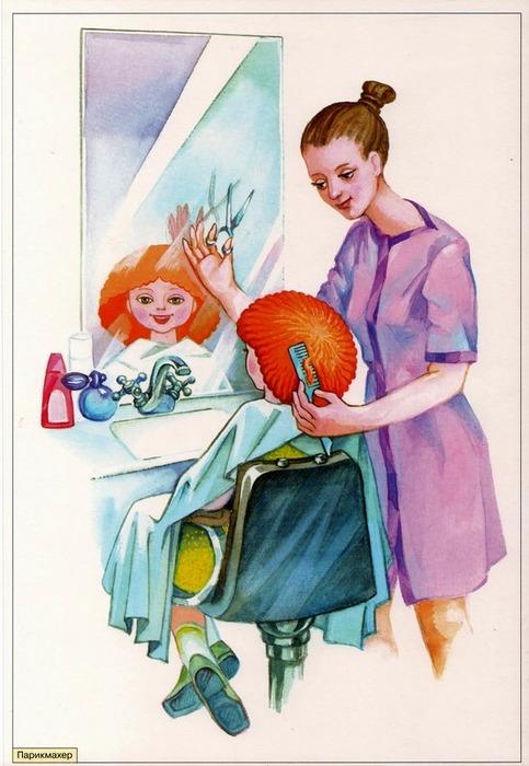 Ребята, а кто знает, как раньше назывался парикмахер? Раньше парикмахеров называли цирюльниками, и они выполняли не только обязанности парикмахеров, но и владели приемами врачевания. Им приходилось: делать парики, шиньоны; расчесывать и укладывать на голове мужские и женские волосы; брить бороду; и даже... дергать зубы и лечить голову от выпадения волос.